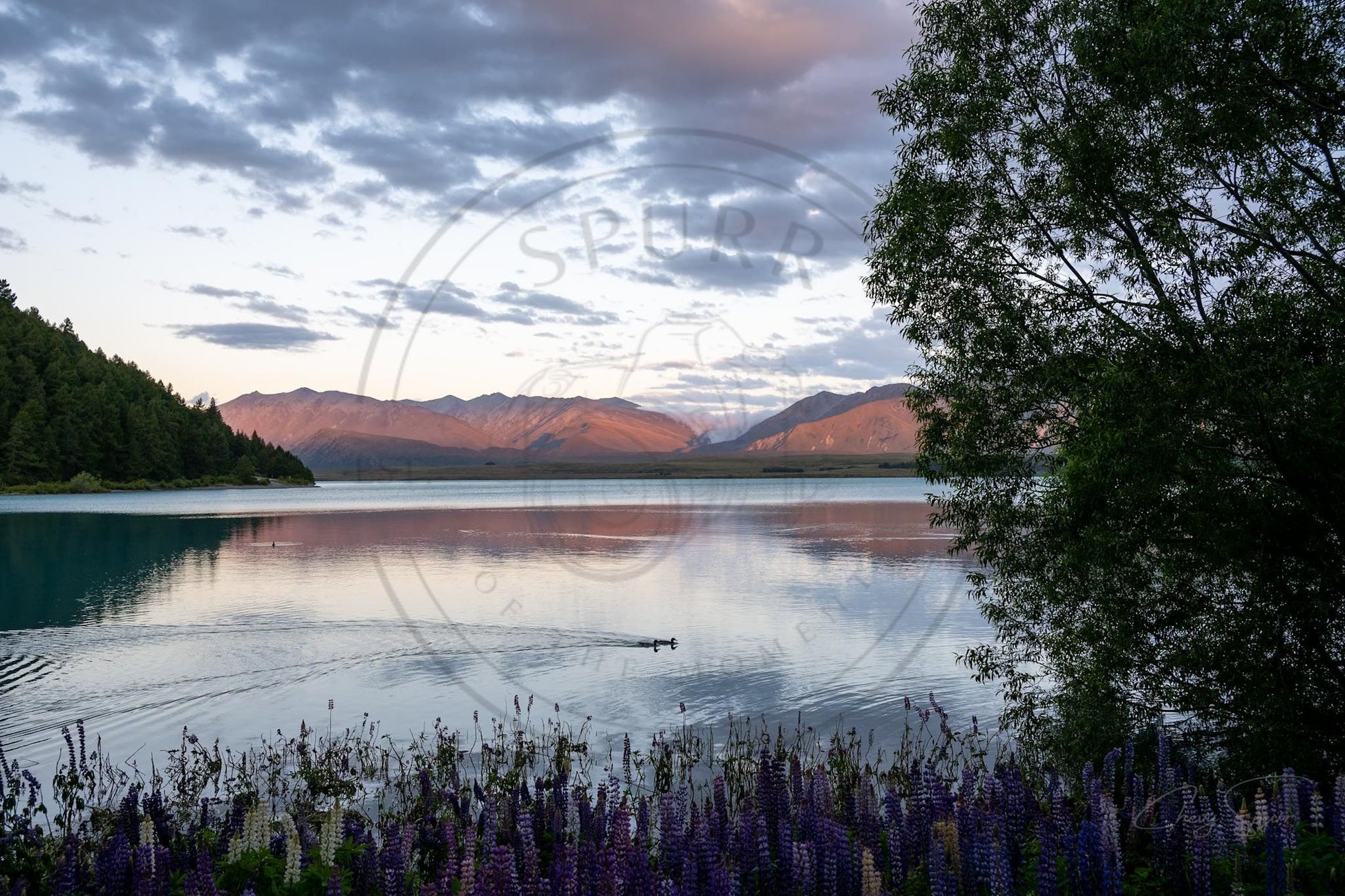 As the sun sets over Lake Tekapo, soft golden light settles across the water and surrounding hills. The lakes glacial blue shifts gently under the warmth of the evening, creating a quiet moment where colour and calm meet.